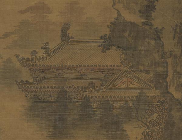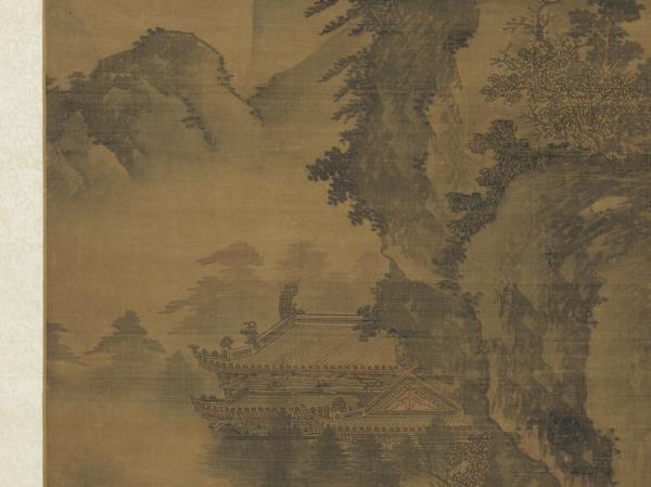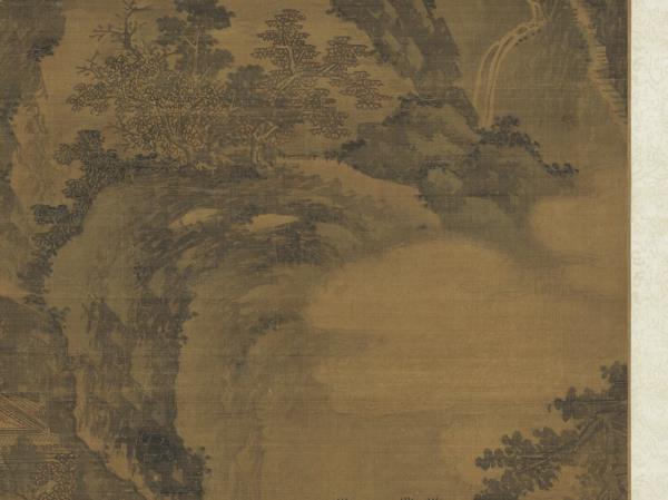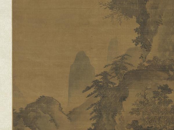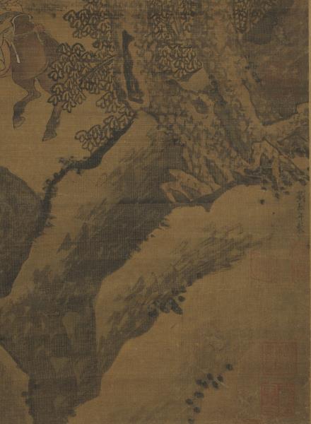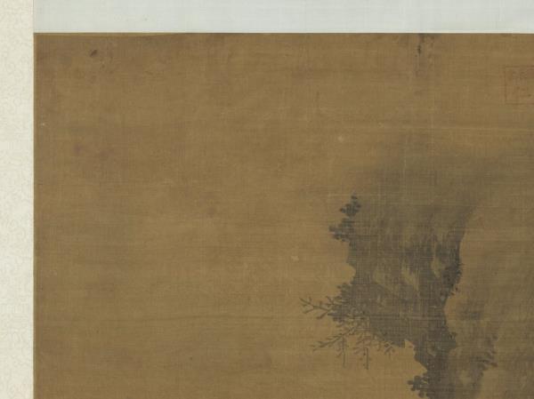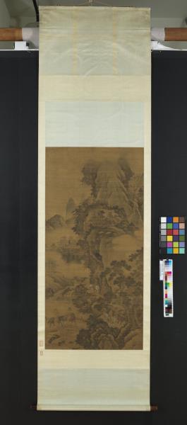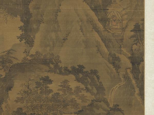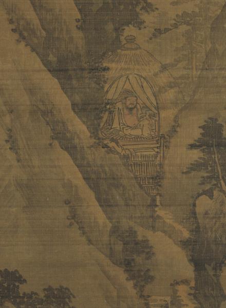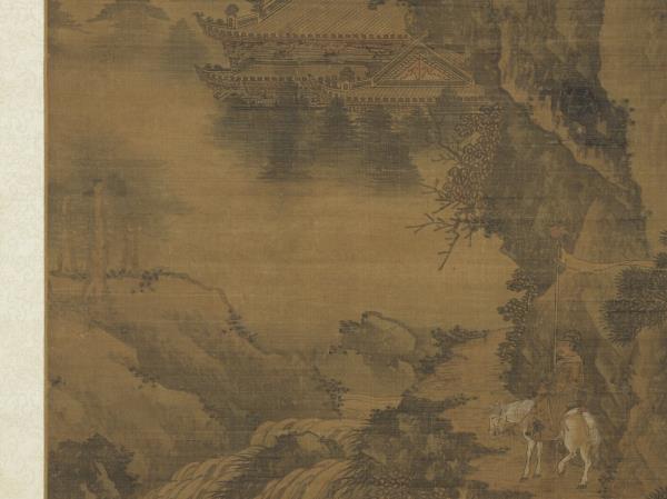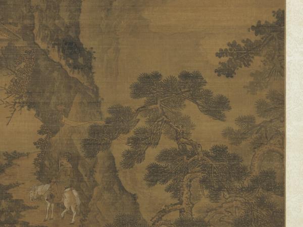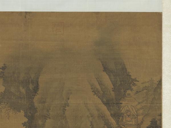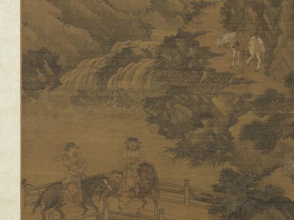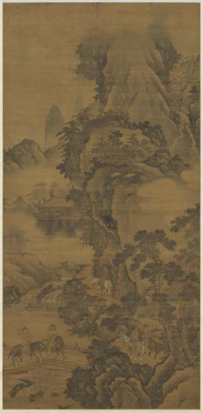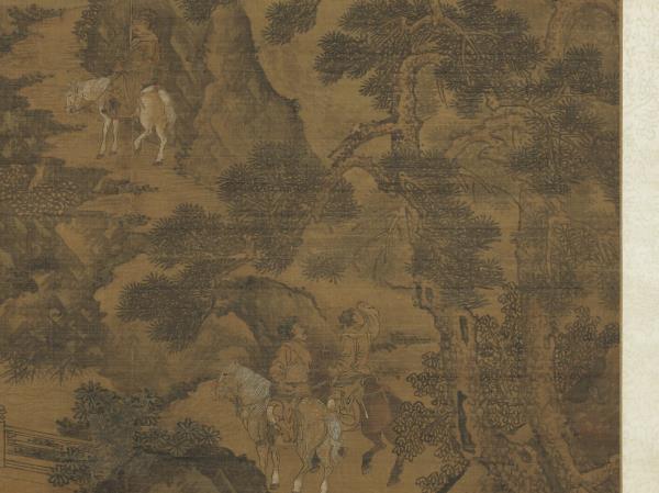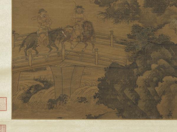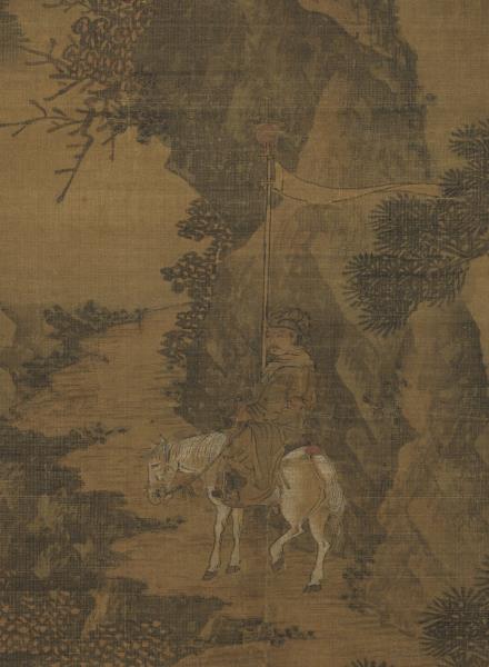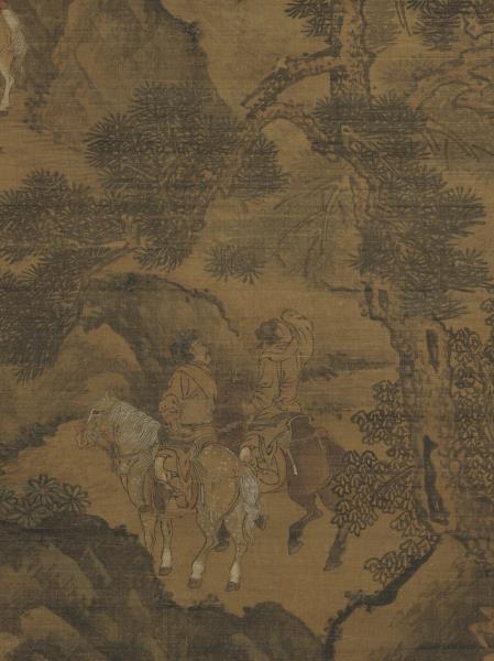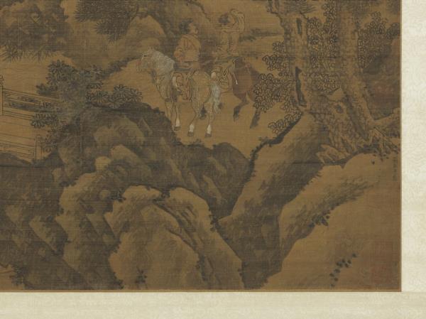 This work narrates what appears to be a scene in which five envoys on horseback, judging from their courtly manner, have been sent by the emperor to the mountain retreat of a scholar and entreat him to come out of seclusion and serve at court. One appears along the path by the stream, two are in the lower right corner looking up at the hermit, and the other two approach on the bridge. All of the motifs have been rendered in the style associated with the Che School of the Ming dynasty (1368-1644), suggesting that this was done at the Ming court. The Liu Sung-nien signature is thus a later addition. Liu Sung-nie served as a court painter in the Southern Sung and was gifted at landscapes and figures, known for his pure and exquisite style.