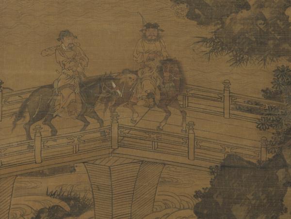 使者五騎,一人持旌前導。二人立馬松下,似有所待。又二者走馬於溪橋之上。畫三國演義中「三顧茅廬」故事。本幅人馬山水,皆有浙派習氣,疑出明畫院一派。畫上雖有劉松年款,當為後添。按劉松年(約西元1190-1230年前後)浙江錢塘人,居清波門,又稱暗門劉。南宋孝宗淳熙年間畫院學生,紹熙年間待詔。山水、人物師法張敦禮,神氣精妙,名過其師。