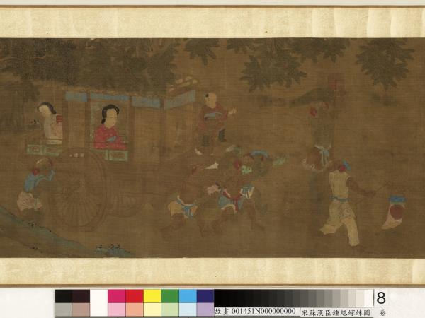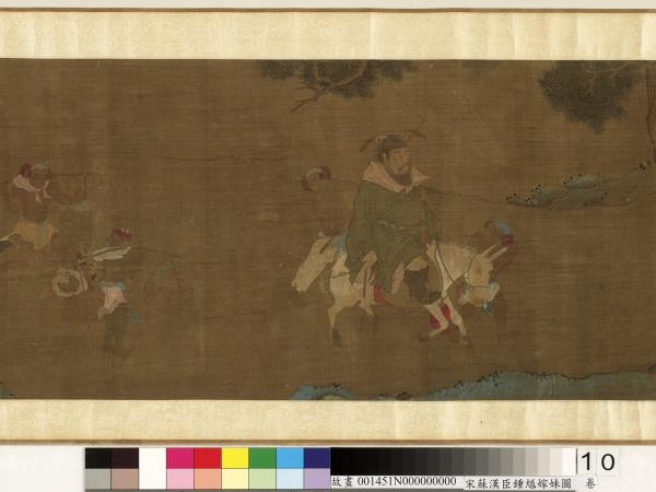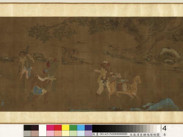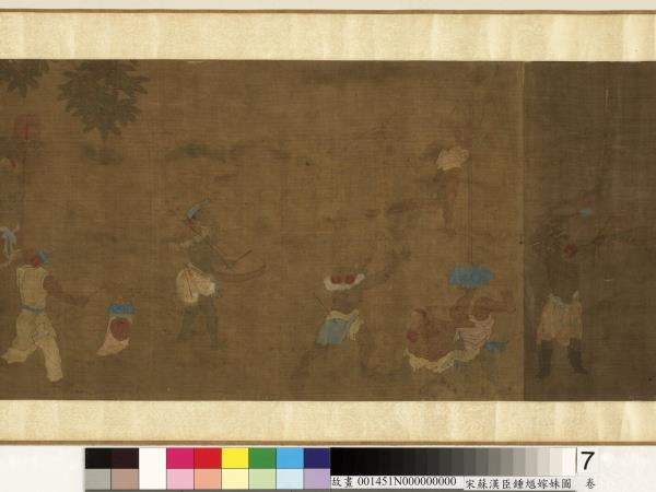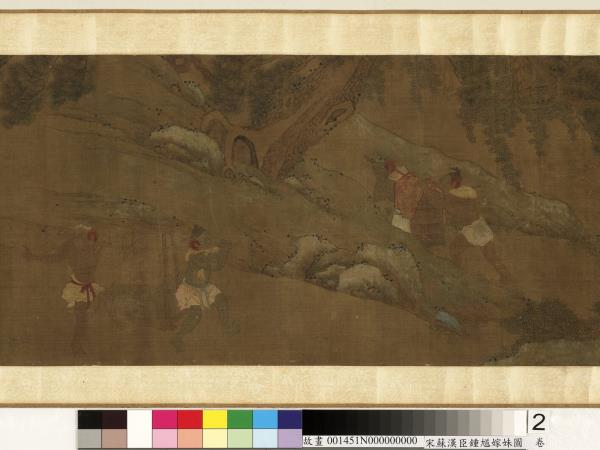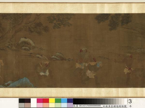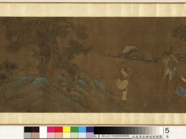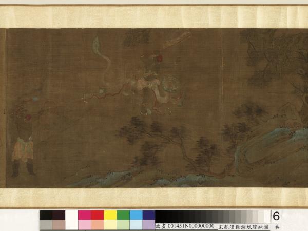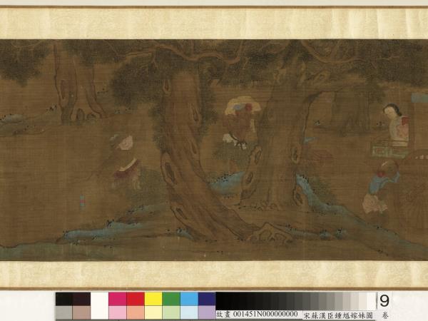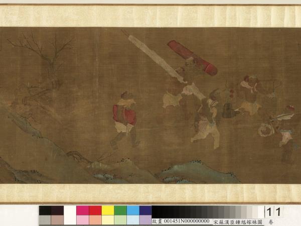 蘇漢臣(西元十二世紀),開封人,師劉宗古。宣和間(1119-1125)入畫院任職待詔。宋室南渡後,再入紹興畫院(1131-1162)。隆興初,且因畫佛像稱旨,授承信郎。長於道釋、人物,尤善畫童嬰。據《宣和畫譜》載,五代時,周文矩、石恪、黃荃等人,均畫過「鍾馗氏小妹圖」,可見鍾馗嫁妹故事,由來甚早。院藏「蘇漢臣鍾馗嫁妹圖」卷,對眾鬼卒的描繪,頗稱用心,耐人細品。惟背景樹石,畫法羸弱,去宋畫漸遠,或更近乎明代後期的特色。