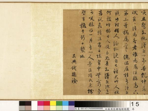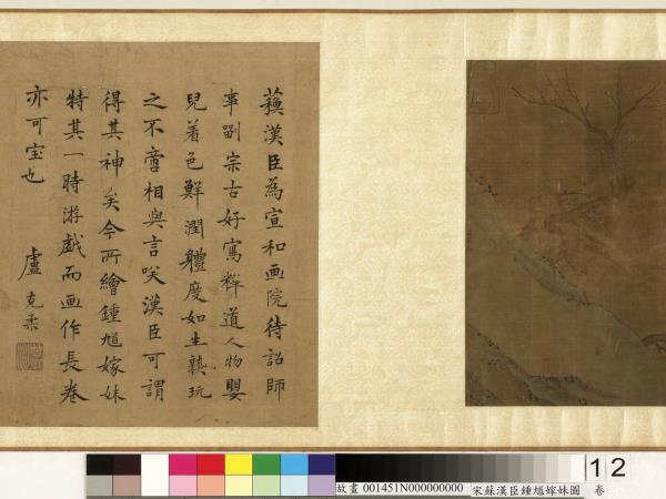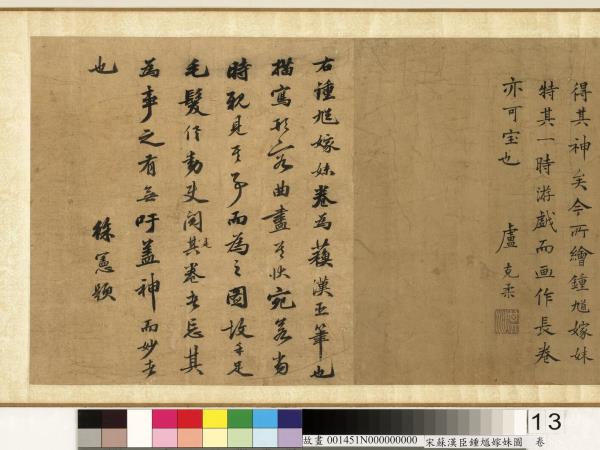 蘇漢臣為宣和畫院待詔。師事劉宗古。好寫釋道人物嬰兒。著色鮮潤。體度如生。熟玩之不啻相與言笑。漢臣可謂得其神矣。今所繪鍾馗嫁妹。特其一時游戲而畫作長卷。亦可寶也。盧克柔。 |