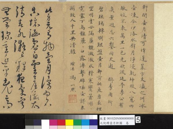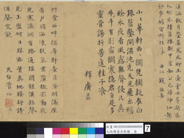 草堂西畔搆層軒。壺月澄明隔座看。戶牖涵凍秋氣肅。簾櫳影動夜光寒。瀛洲有路通瑤闕。銀漢無聲轉(見字點去)玉盤。何日勝遊蕭爽地。賸將詩酒罄交歡。天台管昭。 |