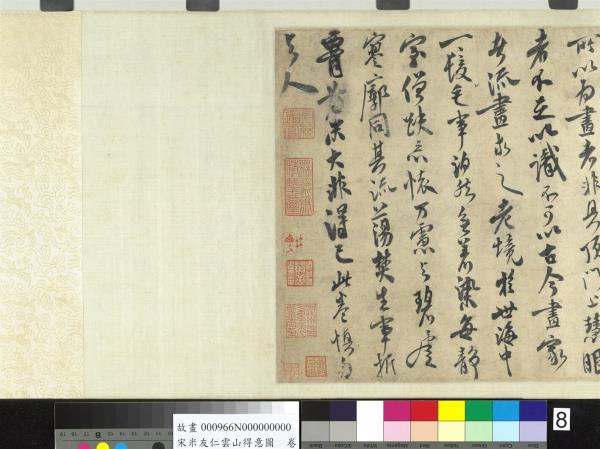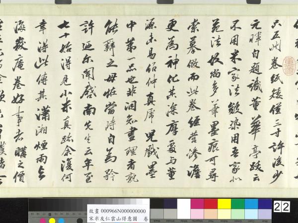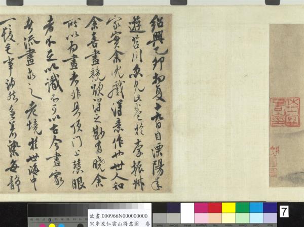 吾潤張氏。藏有元暉矮紙小卷。曾倩友人查梅壑。於焦山僧舍。摹得一本。珍玩之。畫法與此卷無異。至所收五州煙雨圖。則弗如也。今人倣米畫。以點斫微細。便號小米。豈知煙雲幻化。林泉點染。草草而成。能變父法處。獨為超逸。非畫家者流所可及。又予收有海岳手蹟數紙。元暉僅得跋父書兩行。未易多遘。此卷計一百二十餘字。暮年筆力。神采煥發。直入晉人之室。宜知制敷文閣時重於高宗也。曾氏跋。雖屬昔人粘綴。而書法雅正。猶見東都故老遺風。不妨並存耳。笪重光再識。
