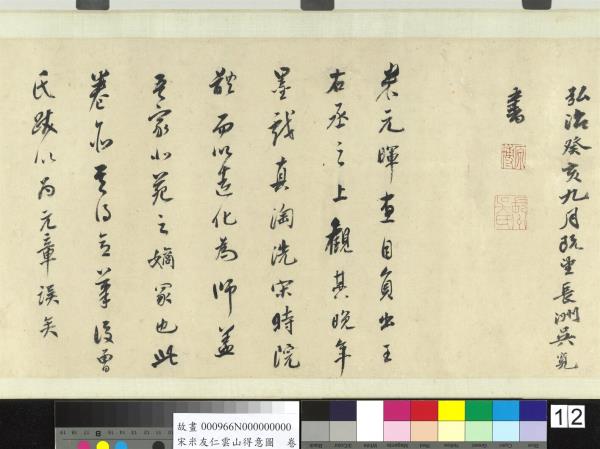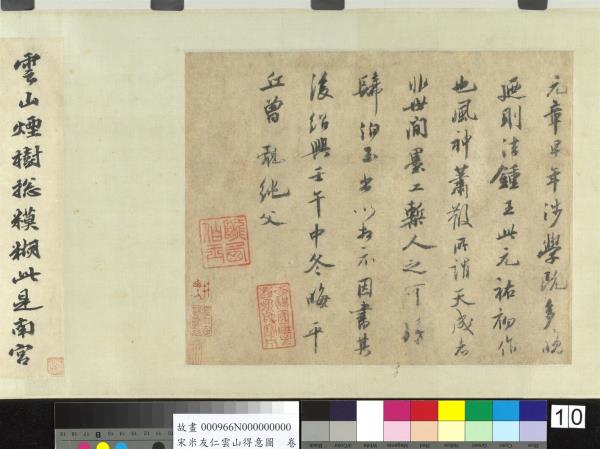 按元章付竇先生十紙。有余年五十始用此紙。又跋謝太傅一帖云。余生辛丑。今太歲辛巳。跋右軍快雪帖云。紹聖丁酉。海岱樓。又吾潤北固海岳菴。有殘缺舊南宮所自寫像。子元暉題讚。亦非盛年之狀。余曾見曾肇所作襄陽墓志草稿。並無享年四十有九之說。觀此則婁跋未為確據。記此以俟博雅者論定云。壬戌孟春因玩畫并記。江上逸光。