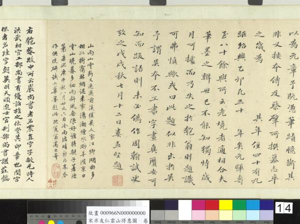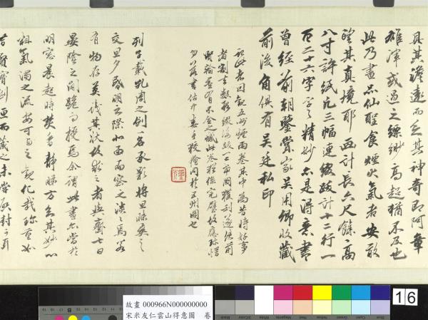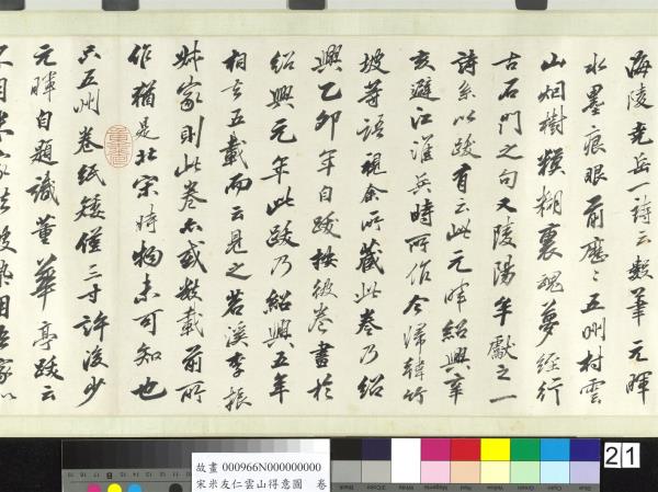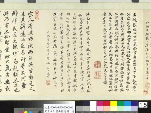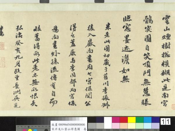 宋人有其巧緻。而無其生動。元人具其澹遠。而乏其神奇。即阿章雄渾或過之。縹緲高超。猶不及也。此乃畫品仙聖。食煙火氣者。安敢望其真境耶。畫計長六尺餘。高八寸許。紙凡三幅連綴。跋計十二行。一百二十六字。字字精妙。亦是得意書。曾經前朝鑑賞家吳用卿收藏。前後角俱有吳廷私印。記此者。因觀五州煙雨卷。其中為昔時好事者割去數段。綴後跋一二。希圖獲利。遂使前賢翰墨。有不全之憾。此卷猶係完璧。故應珍惜。勿落書估中毒手。狡獪同於五州圖也。