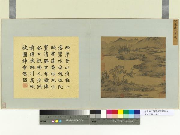 兩岸青山淡雅。一溪碧水淪漣。坡陀映帶遠秀。林木位置清鮮。古寺鐘傳谷口。板橋人步洲前。想像輞川高致。披圖神會悠然。 |