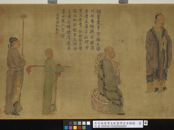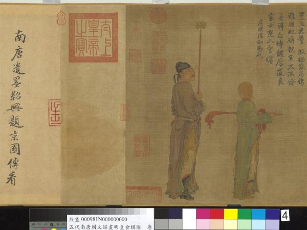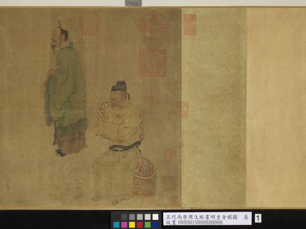 唐明皇(玄宗)對方伎嬉戲之事很有興趣,如擊掬、鬥雞、?奕、按樂,莫不精甚。本幅繪明皇座前置?局,其上空無一子,而優伶拱手而立,好像有話要說,大概是描寫優人向皇帝進諫的故事。畫無名款,舊傳周文矩畫,並有南宋高宗藏印。按周文矩(活動於西元十世紀),建康句容(今南京)人。是南唐李後主朝的宮廷畫家,擅長人物畫與仕女畫,風格近似唐代的周昉,能得閨閣之真態。
