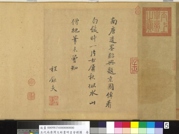南唐遺墨紹興題。京國傳看白髮時。一片古屏秋似水。山僧把筆未曾知。程鉅夫。 |