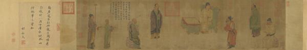 The subject here is attributed to the Tang emperor Minghuang’s fondness of playing “weiqi” (go). He sits on a dragon chair by a go board. A man in red goes to discuss a matter, his back adorned with a jester, suggesting a court actor. The coloring is elegant, the drapery lines delicate, and the figures’ expressions all fine. The Qing emperor Qianlong’s poetry inscription criticizes Minghuang for his infatuation with the concubine Yang Guifei, attributing his neglect of state affairs for the calamities befalling the Tang. Scholarly research also suggests this work may depict Minghuang playing go with a Japanese monk. The old attribution is to the Five Dynasties figure painter Zhou Wenju, but the style is closer to the Yuan dynasty artist Ren Renfa.(20120408)