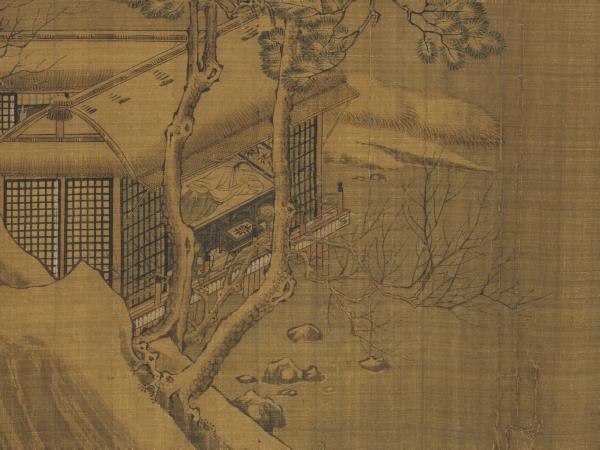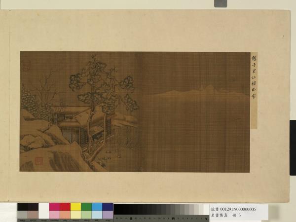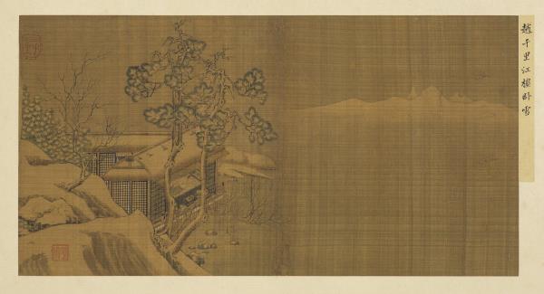 此幀江樓臥雪圖,筆墨工整細緻,屋舍以界畫出之,而白雪皚皚,枯樹雪枝,予人以相當的寒意。以留白表現雪境,頗為成功。畫幅右上角有趙伯駒「千里」二字的杯形圖章,表現了宋人圖章造型的特質。