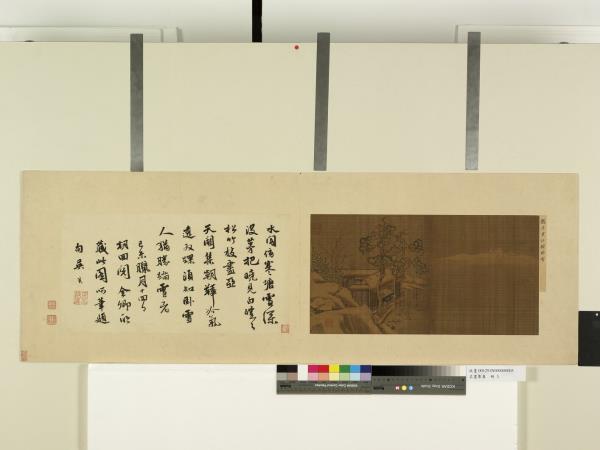 水閣傍寒塘。雪深沒茅把。曉見白皚皚。松竹枝盡亞。天闕集朝鞾。冷氣透雙踝。須知臥雪人。猶勝踏雪者。己未臘月十四日朝回。閱全卿所藏此圖。呵筆題句。吳寬。 |