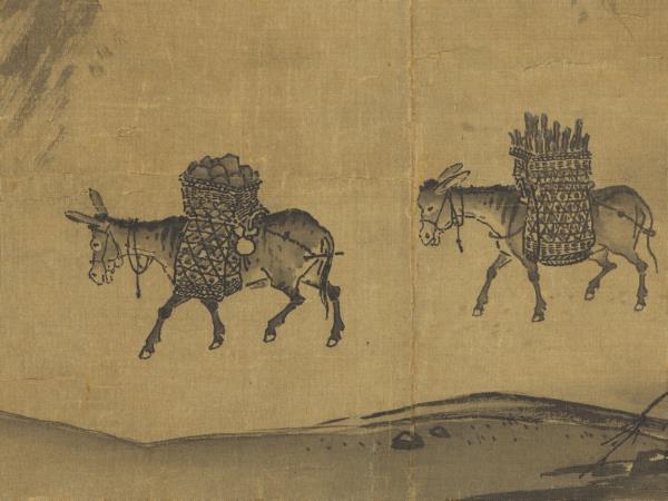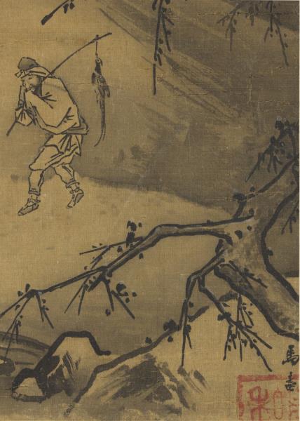 The signature for “Ma Yuan” appears in the lower right corner below the tree trunk. The painting depicts an old man huddled against the cold on a winter’s day as he makes his way in the mountains with two donkeys, the one in front carrying charcoal and the other one firewood. Both seem proceed with difficulty due to their load and the cold. The depiction of the tree and textured landscape forms were mostly done with a blunt brush, while the texturing is in “axe-cut” strokes. The lines for the figure and donkeys, however, reveal slightly “trembling” brushwork. Overall, the handling of the forms is superb, while the succinct lines and accurate ink washes depict the donkeys with precision, even clearly distinguishing the younger and older of the two.