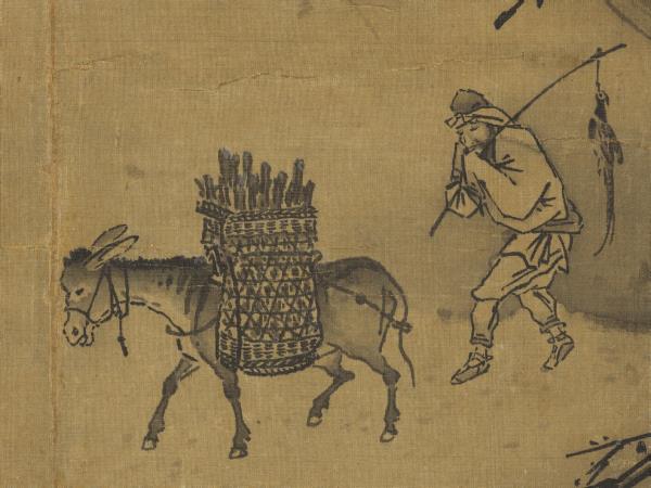 The theme here probably deals with a charcoal seller. The difficult job of collecting firewood and making charcoal in the mountains has led to the dusty appearance of the figure and his ragged clothes. Carrying a wild pheasant he has caught to support his meager income, he makes his way in the freezing cold on a snowy path. Despite the hardships of common folk throughout the year, it is also a scene of plenty as well.(20101015)
