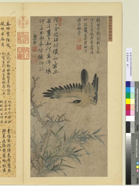 枯枝叢竹間,紙損去大部,畫為後人全補,黃鶯則出於姚手也。此鳥兩翅一伸一斂,首微昂,背不可見,唯可見其腹部。蓋鳥飛甚速,忽見叢竹,急驟之間,突出翻飛而下,故其狀若此。此不僅能寫鳥之形態,兼且得鳥之性情矣。此幅選自「名畫琳瑯」冊。