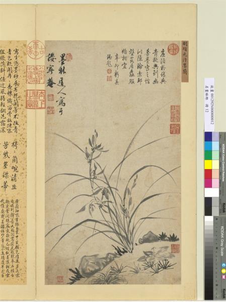 This painting depicts graceful orchids grow from behind a rock. It is done in monochrome ink. Its elegant brushwork indicated the style of literati painting.
