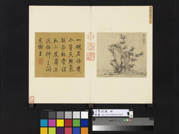 一磈石依幾個篁。天然氣韻正相當。設如二友尋名氏。伯仲之間見謝王。 |
