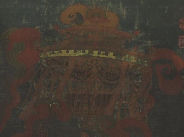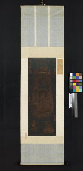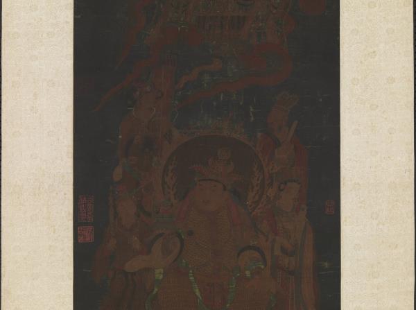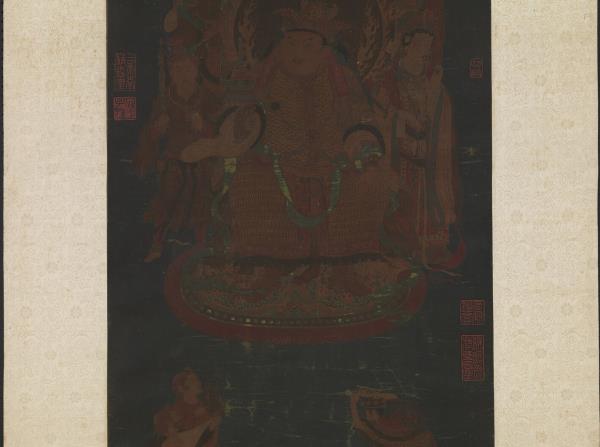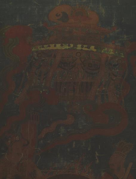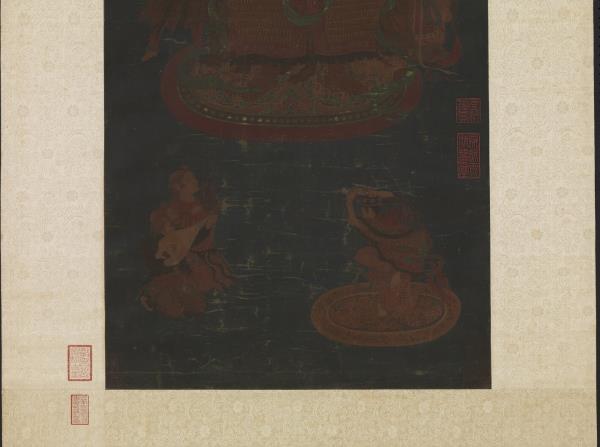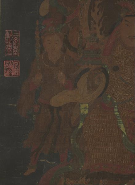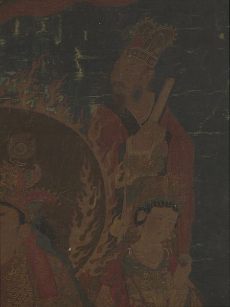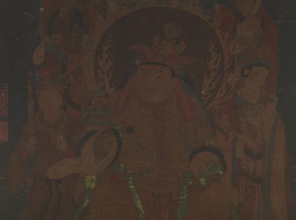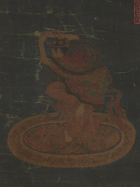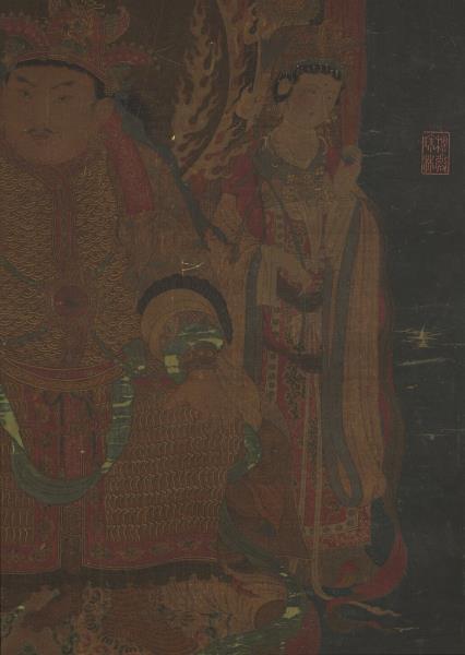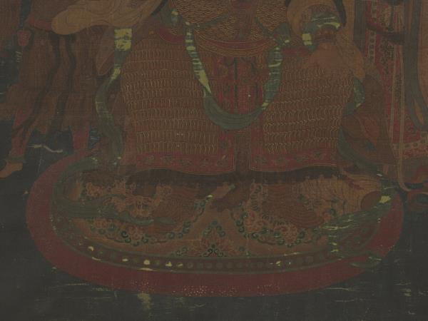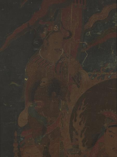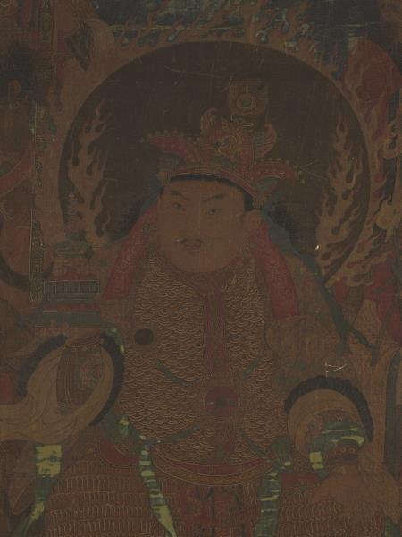 Wu Tao-tzu came from Yang-ch'u. He was summoned by the Emperor Hsuan-tsung (r.813-855) to serve as an imperial tutor and given the name "Tao-hsuan," the same name as the Emperor. He was an accomplished painter of demons, birds, animals, landscapes, and architecture, but his special talent was for Taoist and Buddhist deities. In addition to following the tradition of outline drawing in steely lines which had been popular since the days of Ku K'ai-chih, he also introduced a technique of line drawing in which the same line could be both broad and thin, thus being able to express the effect of clothes blowing in the wind. The phrase "Wu clothing" was used to describe this technique. Wu Tao-tzu established the canons for later generations of figure painters. He has been called the "painting saint for a bundred ages." This form of the Buddha, also called the King of the North, was the most popular form during the High T'ang period.