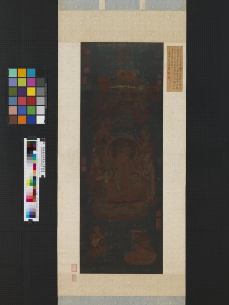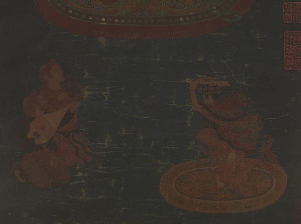 金甲裝校。現賓伽羅以威神力。降伏諸魔。寳蓋住空。八部拱手。既舞既歌。亦空亦有。瘦金所識。道子作圖。如水中月。是乎否乎。庚寅(西元一七七0年)新正御贊。 |