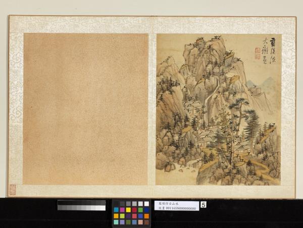 This leaf reflects a reconstruction of rocks, flat outcroppings, and alum-head rounded stones that Huang Gongwang commonly used in painting. Complemented by the cascade that drops from the mountain and the clusters of trees rising straight up, they create a landscape composition of precipitous proportions. Grasping the brush firmly to create angular turns, the artist created a free and spirited feeling. Outlines for the forms take the place of textured strokes and are covered with washes of cyanine blue, ochre, and gamboges yellow, giving the painting an even brighter and more beautiful effect.