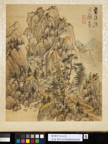 此幀為〈倣古山水冊〉第五開,其中臨仿眾多唐至元之間山水大家,如王維、郭熙、趙令穰、李唐、趙孟頫、元四大家等。藍瑛於冊中第十與十二開題「乙亥」(1635),可知此套冊頁應成於藍瑛五十一歲時。