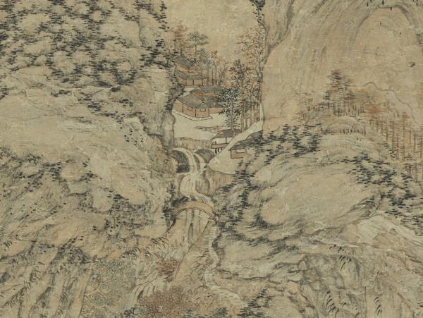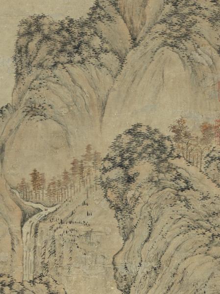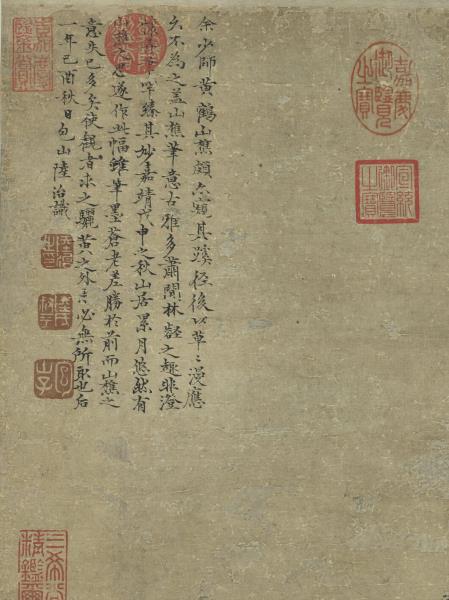余少師黃鶴山樵。頗亦窺其蹊徑。後以草草漫應。久不為之。蓋山樵筆意古雅。多蕭閒林壑之趣。非澄懷弄筆。罕臻其妙。嘉靖戊申(1548)之秋。山居累月。悠然有山樵之思。遂作此幅。雖筆墨蒼老。差勝於前。而山樵之意。失已多矣。使觀者求之驪黃之外。未必無所取也。后一年己酉(1549)秋日。包山陸治識。 |