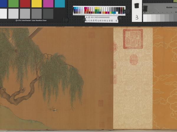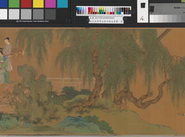 周文矩(西元十世紀),建康句容(今南京)人。仕後主李煜為翰林待詔,善繪冕服車器,尤工人物仕女。所作人物,線條率皆細勁曲折,圓潤流暢,間作顫動之勢,飄逸自若,能自成一家面目。至若綺羅仕女,雖近承唐代周昉,惟其纖細秀麗,益有過之。本卷繪春柳臨池,鴛鴦戲波,宮苑內,眾女仙群集文會。通幅皆重彩設色,妍麗無倫。款繫治平三年,按南唐無此年號,當係後人偽署。