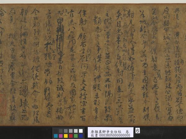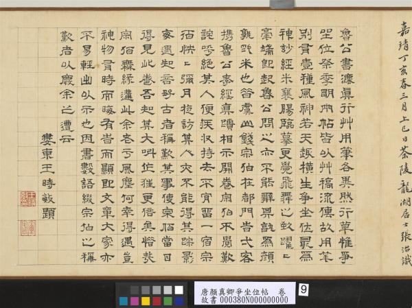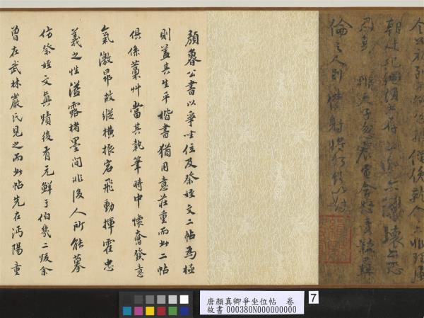 顏魯公書以爭坐位及祭姪文二帖為極則。蓋其生平楷書猶用意莊重。而此二帖俱係藳草。當其執筆時中懷奮發意氣激昂。故縱橫振宕飛動揮霍。忠義之性溢露楮墨間。非後人所能摹仿。祭姪文真蹟後有元鮮于伯幾二跋。余曾在武林巖氏見之。而此帖先在沔陽童漢臣處。前後有緝熙殿寶。岐縫有賈似道印。蓋宋徽宗御府物而後歸于賈相者。人或疑為米南宮所臨。然筆灋與祭姪文鋒芒機構大致相同。故漢臣獨謂為魯公真蹟洵具眼也。要之魯公真蹟固為希代之珍。即係南宮臨本亦推名世之寶。雖紙色頗黑暗。字間有漫滅。亦何足損連城萬一哉。嘉靖丁亥春三月上巳日。茶陵龍湖居士張治識。 |