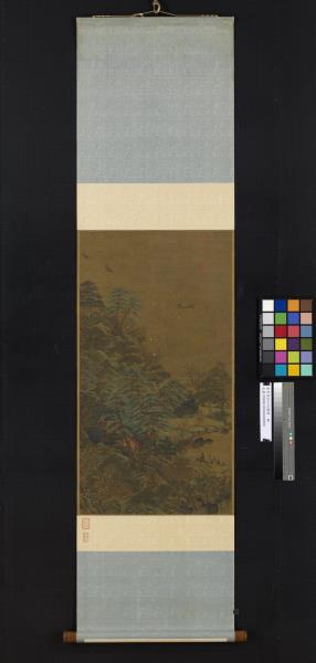 江天闊渺,風帆溯流,山嶺間長松、翠竹掩映,山徑層疊,文人雅士悠游其間。全作設色穠麗古雅,山石用墨線鉤勒輪廓,青綠渲染,不見皴筆。圖案化的夾葉饒富裝飾意趣。此幅無作者款印,依據舊籤定名。李思訓(約653-718),唐宗室,善畫青綠山水,風格工巧繁縟。雖然此幀的構圖與畫樹竹的筆法,皆與唐畫不類,但保存了唐代青綠山水的遺風,是研究李思訓山水的一件重要作品。(20110913)
