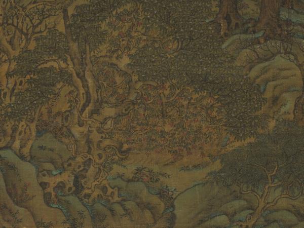 By a vast expanse of sky and river appear sails in the wind going against the flow. In the shade of tall pines and verdant bamboo along the mountain ridges are layered pathways where literati and gentlemen leisurely stroll. The coloring throughout is luxuriantly beautiful and classically archaic, with strokes of ink to outline and define the landscape forms. Washes of blue and green were added, but texture strokes are not to be found here. The patterned outlining of the leaves also has a strong decorative effect. This work bears neither seal nor signature of the artist, but Li Sixun is given as the artist in the old title label. Li Sixun, a member of the Tang imperial clan, excelled at painting blue-and-green landscapes in a style both exquisite and complex. Although both the composition and brushwork for rendering the trees and bamboo here are unlike those found in Tang paintings, this work still preserves traces of Tang blue-and-green landscapes, making it an important example for the study of Li Sixun’s landscape painting.(20110913)