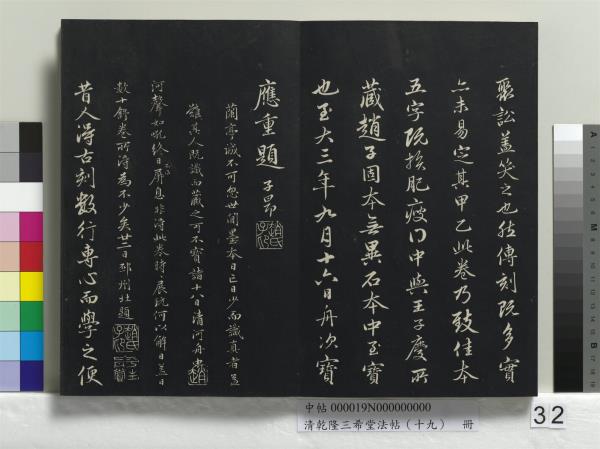 | 著錄細目 | 清乾隆三希堂法帖(十九) 冊 晉王羲之蘭亭敘暨元趙孟頫蘭亭十三跋 | 04 | 28-37 | 28-37 |