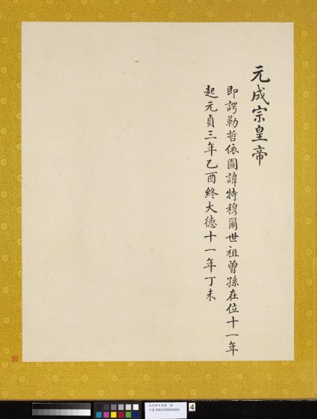 | 題跋 | 對幅 | 楷書 | 元成宗皇帝。即諤勒哲依圖。諱特穆爾。世祖曾孫。在位十一年。起元貞三年(西元一二九七年)乙酉。終大德十一年(西元一三0七年)丁未。 |