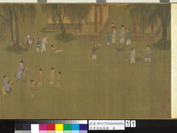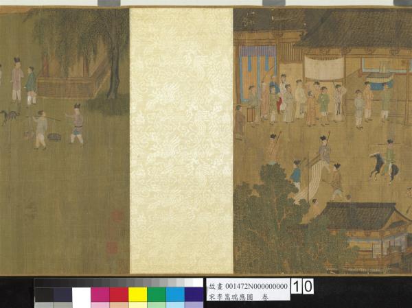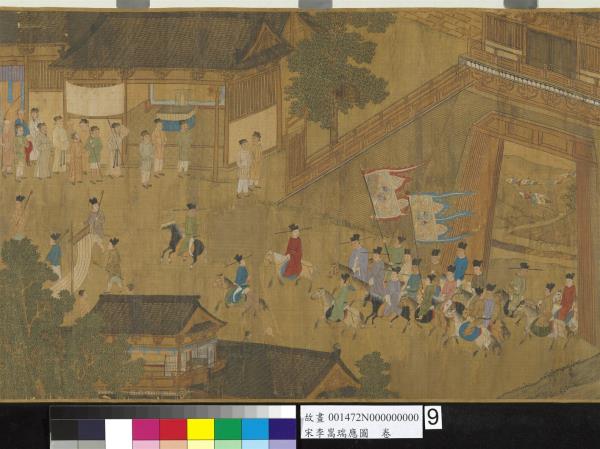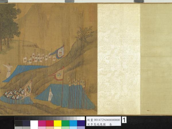 The Southern Song official Cao Xun once compiled stories of the auspicious omens that predicted the assumption of the throne by Emperor Gaozong into 12 sections, which were illustrated by the Academy painter Xiao Zhao. The 12 omens are 1) “Golden Aura at Birth,” 2) “Xianren’s Dream of a Deity,” 3) “Archery and Lifting,” 4) “Envoy to the Jin,” 5) “Four Deities Protecting,” 6) “Visiting a Cizhou Temple,” 7) “Game Pieces in a Yellow Bag,” 8) “Deceiving the Enemy,” 9) “Shooting a Tower Plaque,” 10) “Shooting a White Rabbit,” 11) “Crossing a Frozen River,” and 12) “Dream of Removing the Robe.” This handscroll illustrates the 4th, 5th, 9th, and 11th sections. Although attributed to Li Song, it is actually a Ming dynasty (1368-1644) copy.(20091016)