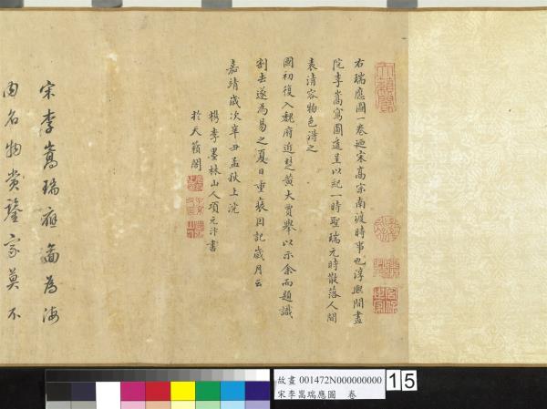 右瑞應圖一卷。迺宋高宗南渡時事也。淳熙間畫院李嵩寫圖進呈。以紀一時聖瑞。元時散落人間。袁清容物色得之。國初復入魏府。近楚黃大賈舉以示余。而題識割去。遂為易之。夏日重裝。因記歲月云。嘉靖歲次辛丑(西元一五四一年)孟秋上浣。檇李墨林山人項元汴書於天籟閣。 |