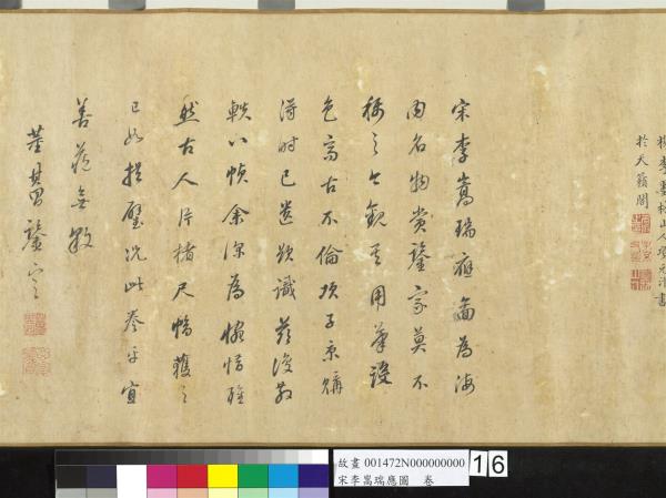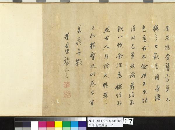 宋李嵩瑞應圖。為海內名物。賞鑒家莫不稱之。今觀其用筆設色高古不倫。項子京購得時已遺題識。茲復散軼八幀。余深為惋惜。雖然古人片楮尺幅。獲之已如拱璧。況此卷乎。宜善藏無斁。董其昌鑒定。 |
