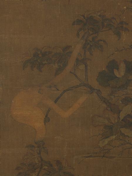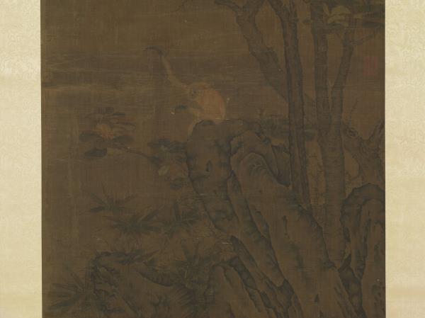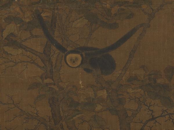 With no seal or signature of the artist, this work was attributed to Han Kan. A native of Ta-liang (modern K’ai-feng, Honan), he is also said to be from Ch’ang-an or Lan-t’ien. Called to court in the T’ien-pao era (742-755), he studied under Ts’ao Pa and was famous for painting horses, being admired by the T’ang critic Chang Yen-yuan. In this work of bamboo, rocks, and trees are 3 gibbons among branches and on a rock. Below are a black and a white steed leisurely trotting. The inscription and yu-shu (“imperial work”) seal of the Sung emperor Hui-tsung and “Treasure of the Ch’i-hsi Hall” seal of the Sung emperor Li-tsung are spurious and later additions. All the motifs are finely rendered, though, suggesting a Southern Sung (1127-1279) date.