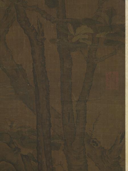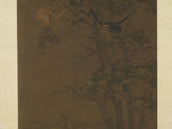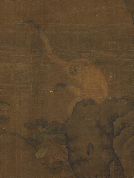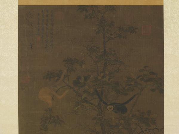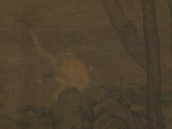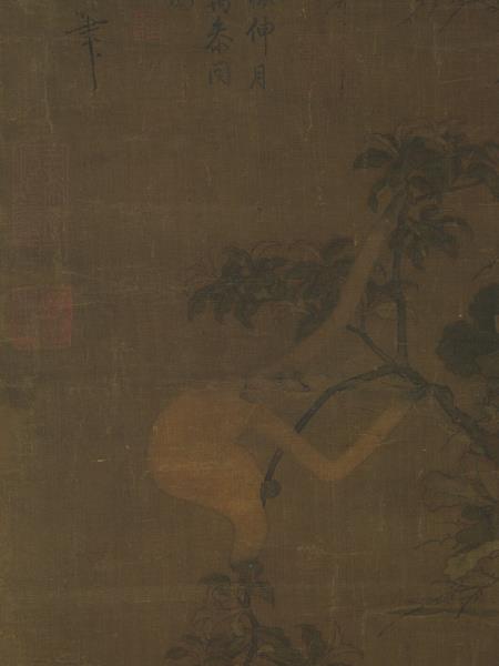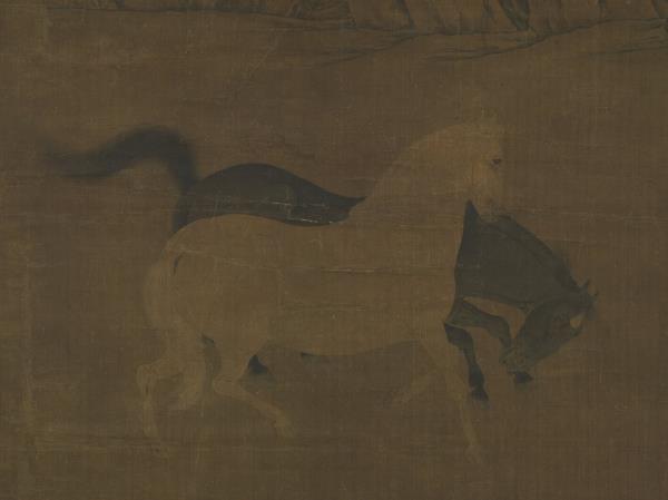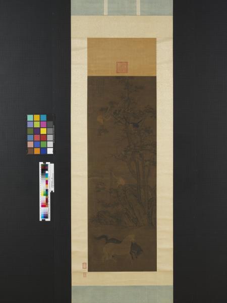 此幅繪竹石樹林,三猿戲於枝間石上,其下繪黑白雙駿,作徐行之狀。無款,舊題韓幹作,但徽宗題字和「御書」一璽,及理宗「緝熙殿寶」璽皆存疑,故當為後人仿作。韓幹,大梁人(河南開封),亦有作長安或藍田人。天寶(七四二-七五五)初,召入宮中為供奉。曾師曹霸,以畫馬而得名,唐張彥遠極為推崇之。