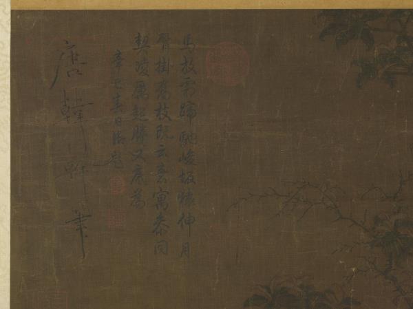 In the upper part of this picture are three gibbons-one plays on a large rock and two are among tree branches. Under the tree, two horses canter side-by-side. Though the painting has neither seal nor signature of the artist, it has been traditionally attributed to Han Kan. The Hui-tsung (r. 1101-1125) inscription and Yu-shu ("Imperially-written") seal, as well as the Ch'i-hsi-tien pao ("Treasure of the Ch'i-hsi Hall") seal of Li-tsung (r.1225-1264), also seem suspicious, suggesting that this painting was probably done by a later painter. Han Kan was a native of Ta-liang (K'ai-feng, Honan), though some records indicate that he came from Ch’ang-an or Lan-t'ien, Shensi. He entered court service in the early T'ien-pao era (742-755) as a painter and studied under Ts’ao Pa, a famous painter of horses. He, too, became famous for painting horses. His works were highly admired by Chang Yen-yuan (ca. 815-after 875), the T'ang connoisseur and critic.