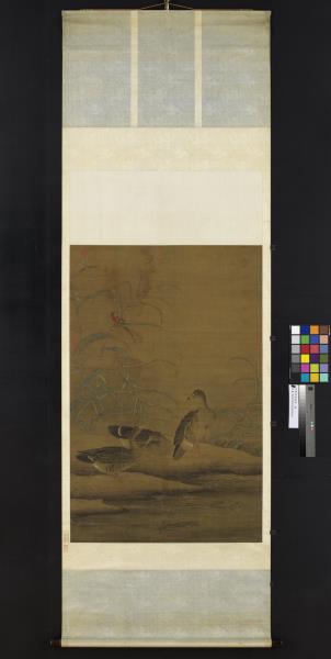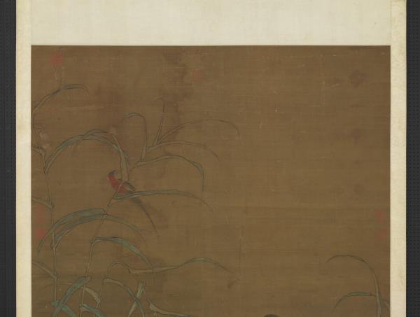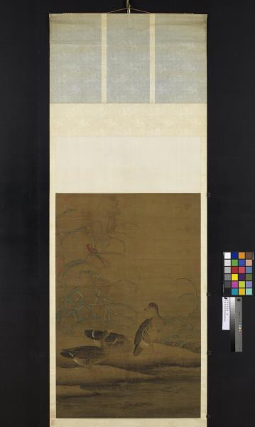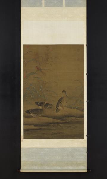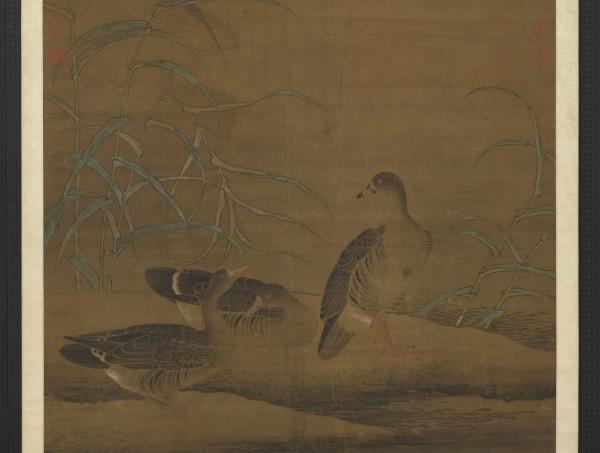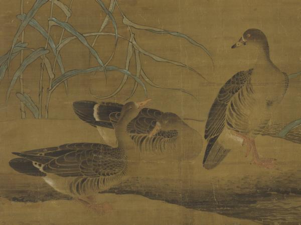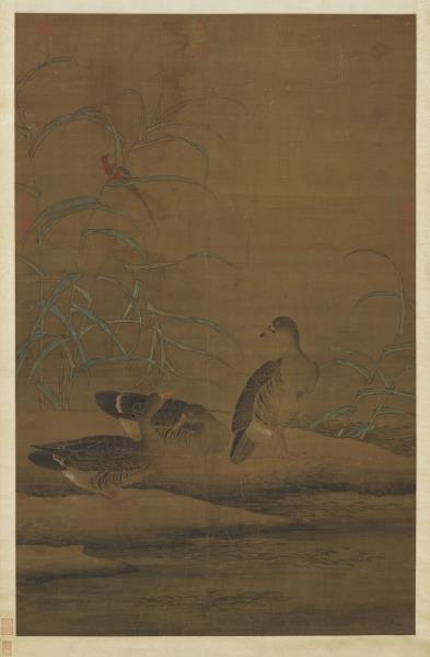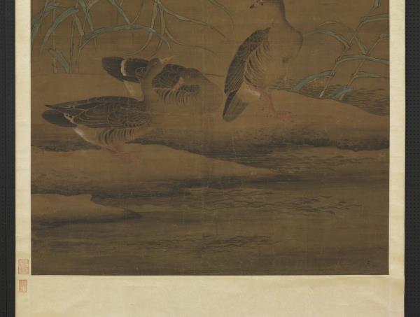 This work depicts a river against a misty backdrop as water laps against a wintry bank. Three geese are on the bank; one draws in its neck with eyes closed as the other two look around as if on guard. Several stalks of reeds grow behind them. The somber tone conveys the lonely cold of winter. Huang Chu-ts'ai , a native of Ch'eng-tu in Szechwan, was the third son of Huang Chuan , the famous painter of bamboo and animals, decorative rocks, and landscapes. After the Five Dynasties state of Shu fell, he joined the Sung. Rewarded by Emperor T'ai-tsung, he was ordered to search for famous paintings and to serve as court connoisseur. The Huang Chuan style thus became the standard for quality in the early Sung painting academy.