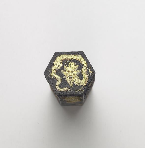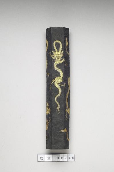 六角形柱狀墨。墨面模印雲紋為地,並有多條飛龍騰繞其間為飾,飛龍均塗以金彩。墨之一端亦模印有雲地金龍紋為飾。此墨一式五件,同儲於一屜。