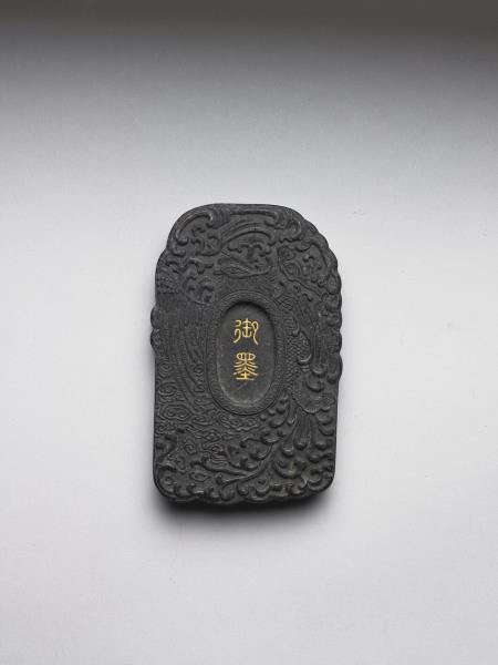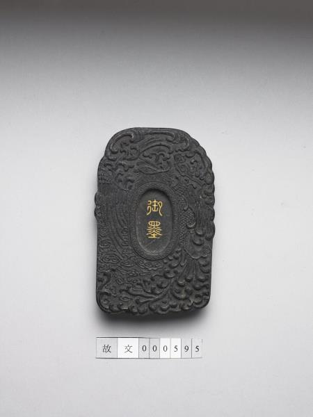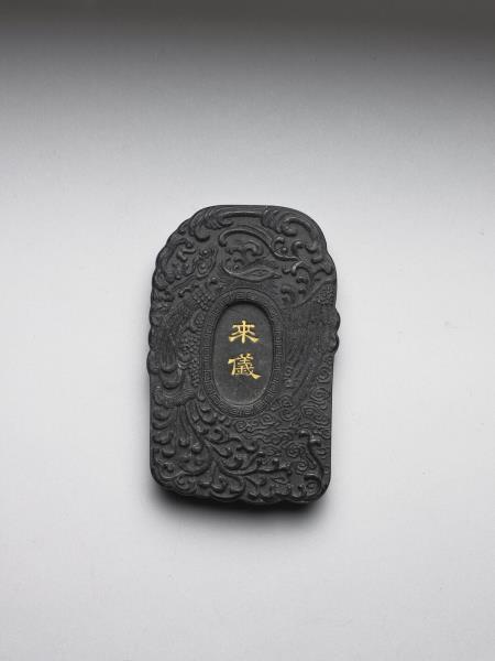 黑墨,外廓為卵形近方,墨面皆模印一鳳飛舞雲間,並曲身繞圍墨面中央橢圓形開光,兩面之開光分別飾以填金「御墨」篆字與「來儀」隸字。此墨與其他二十九墨同儲於一盒。