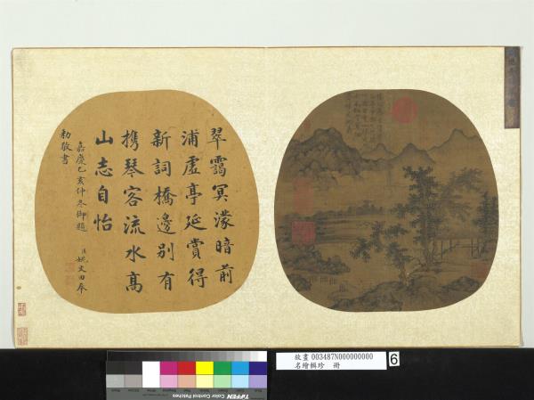 翠靄冥濛暗前浦。虛亭延賞得新詞。橋邊別有攜琴客。流水高山志自怡。嘉慶乙亥(西元一八一五年)仲冬御題。臣姚文田奉敕敬書。 |