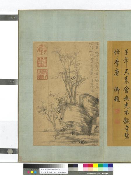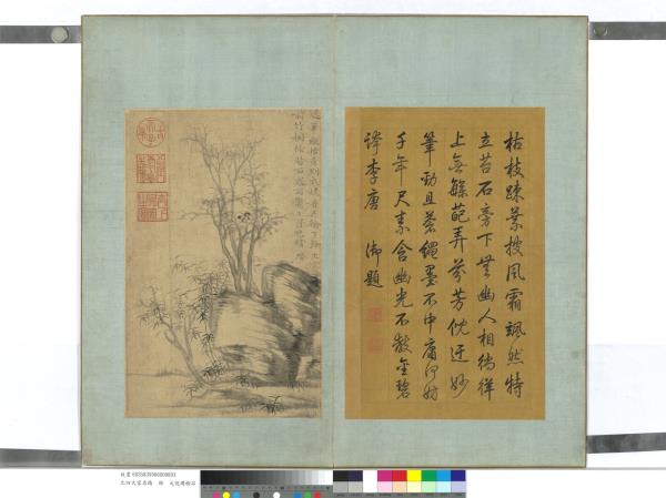 枯枝踈葉披風霜。颯然特立苔石旁。下無幽人相徜徉。上無繁葩弄芬芳。倪迂妙筆勁且蒼。繩墨不中庸何妨。千年尺素含幽光。不教金碧誇李唐。御題。 |
