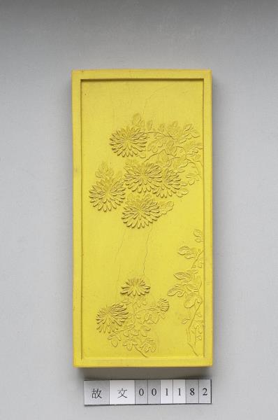 | 說明 | 長方形黃色墨,邊框起棱。一面有填金隸書乾隆詩作:「御詠菊。幾朵蕭蕭迴絕埃,不霜寄傲不根栽,世間黃紫工設色,卻與菊華失本來。」一面模印菊花盛開之狀。是墨與其他二十四塊同儲一盒,為成套之御製花卉詩套墨。 |