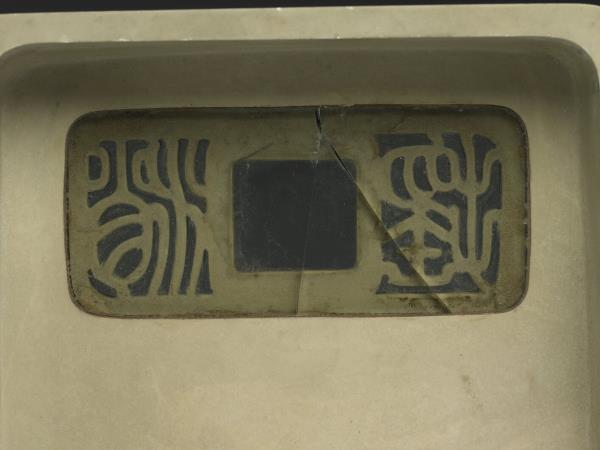| 說明 | 淡綠色方形硯盒,盒蓋上方嵌土黃色石雕古龍紋長方框,方框中間再雕一方框並開孔內嵌玻璃,兩側鏤刻「逍遙」二篆字。可透視硯池內之波濤紋。蓋面下方大半部分陰刻楷書莊子〈逍遙遊〉前段:「北溟有魚,其名為鯤。鯤之大,不知其幾千里也。化而為鳥,其名為鵬。鵬之背,不知其幾千里也;怒而飛,其翼若垂天之雲,是鳥也,海運則將徙於南溟。南溟者,天池也。齊諧者,志怪者也。譜之言曰:鵬之徙於南溟也,水擊三千里,摶扶摇而上者九萬里,去以六月息者也。野馬也,塵埃也,生物之以息相吹也。天之蒼蒼,其正色耶?其遠而無所至極耶?其視下也,亦若是則已矣。」並刻方印二,一減地浮雕篆書二行二字:「天府」,一陰刻篆書二行二字:「珍藏」。盒蓋側面陰刻隸書四字:「咸豐鑑賞」。盒背周緣起一圈寬棱,中央凹下正中部位陰刻填靛篆書四字:「康熙年製」。硯盒與所嵌玻璃今已傷破。 |