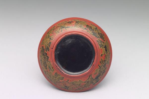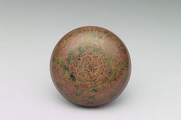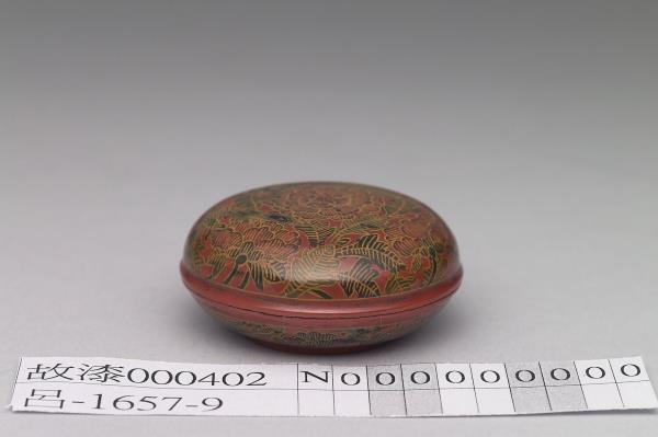 | 說明 | 扁圓形盒,圈足,胎薄,盒內髹紅漆,足內的黑漆當為後代重髹。盒底飾側視的牡丹四朵,間飾葉片二、三,盒蓋中央一俯視的牡丹,暈染的紫色花瓣,嬌嫩鮮豔,外圍有四朵側視的牡丹,花旁以葉片相連順時針方向圍繞,偶見一、二小段枝幹。漆色潤,彩度高,主要用紅、綠、淺綠、紫等色彩,以黃色描寫輪廓,並加上細密整的瓣脈與葉脈線條,顯得亮眼精緻。 |