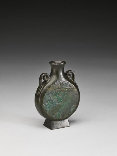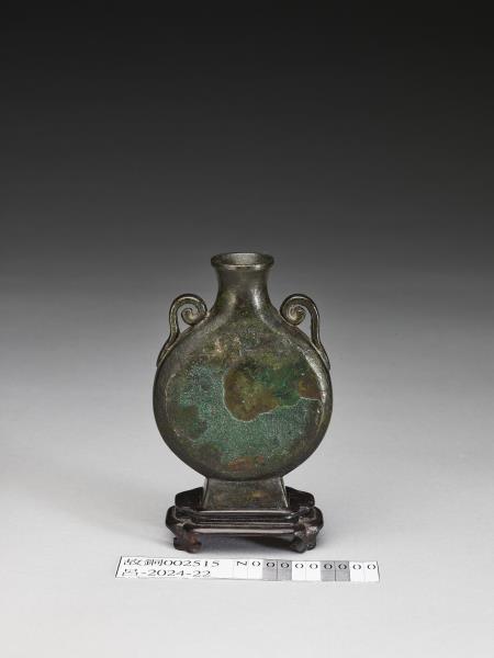 圓口、微曲頸、圓鼓腹、方足。上腹側雙附耳。附木座。