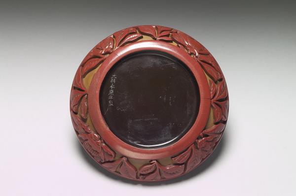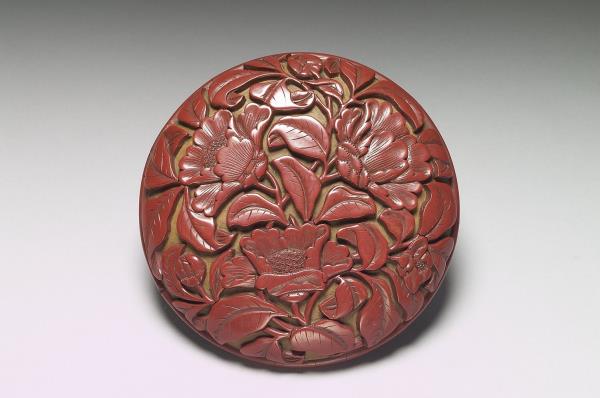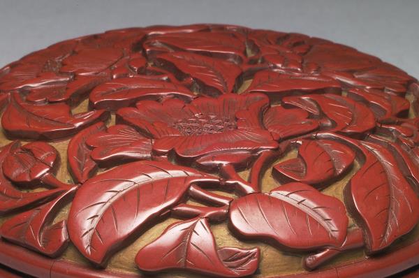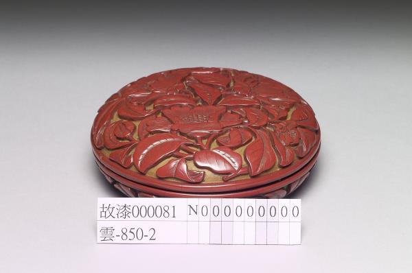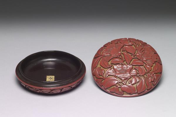 | 說明 | 扁圓形盒,子母口,圈足,底部及盒內髹褐漆。盒面雕折枝茶花,主枝自下緣伸展,接著一盛開的花朵,穿過圓心,向左開一大花,接著向右開一大花,盒面三朵大花平均居圓三角,其間或花蕾或小花。底有「大明永樂年製」六字款。 |