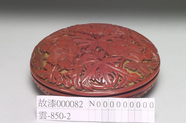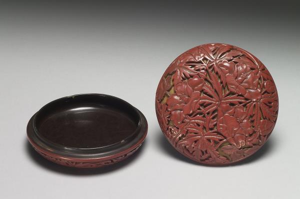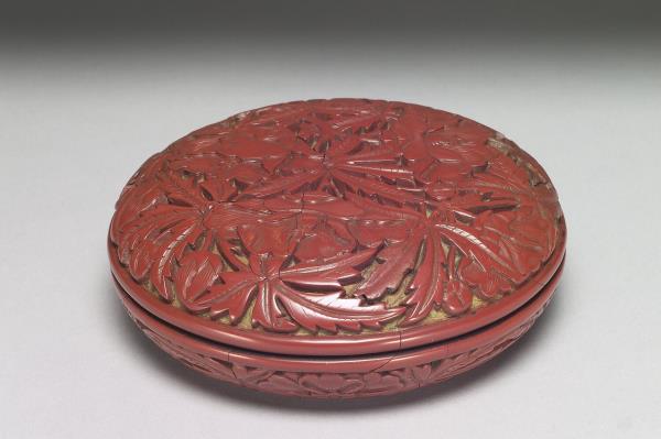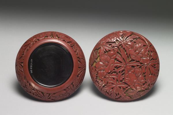 | 說明 | 扁圓形盒,子母口,圈足,盒內及底髹褐漆。盒身四株花朵間隔著一、二片葉片。盒面中心為一葉,外圍平均分佈三朵盛開的大花,花間外各一大葉,或夾雜著花蕾,枝幹穿梭於葉上、葉下,葉片疊壓著葉片與花朵,刻意表現物象重疊的關係,使構圖顯得複雜。漆色紅潤,間露黃色地漆,刀法硬直,花瓣起伏變化較硬,中央葉脈深度變化一致,漆面打磨變化銳利,似壓花般具裝飾性。底有「大明永樂年製」六字款。 |