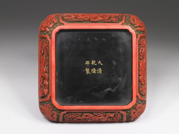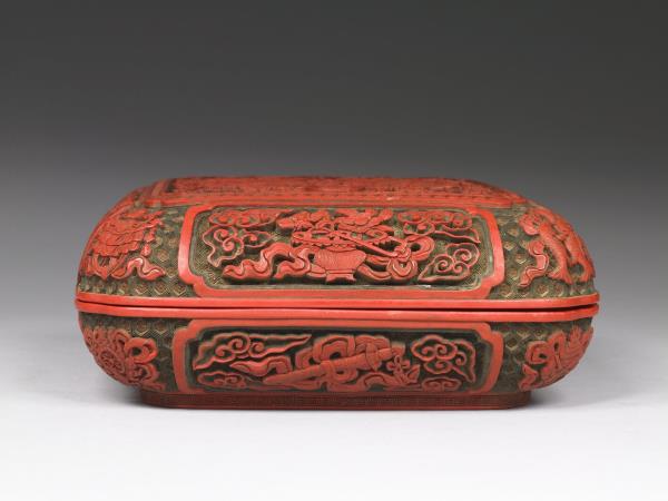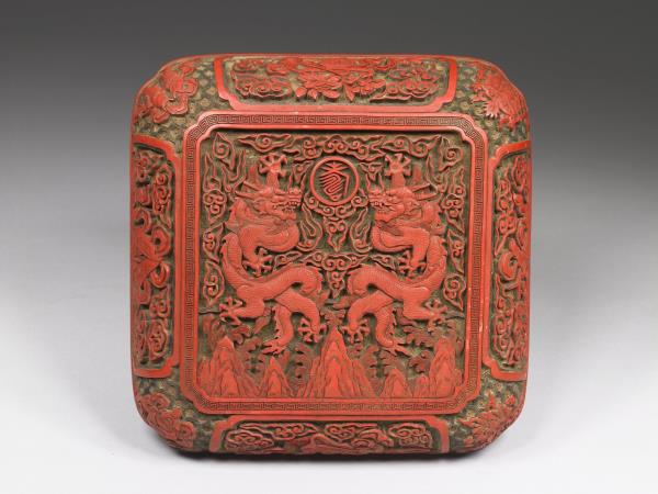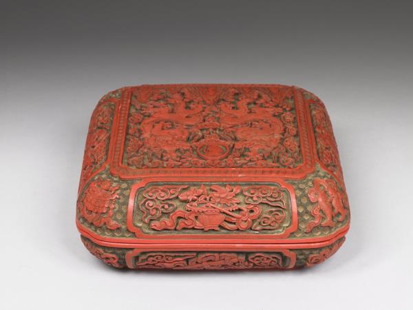 | 說明 | 四方雕漆盒,四角圓弧,有方圈足。器之外壁計有八個方形委角開光,開光中分別剔彩暗八仙為飾。蓋面正中以回紋圍成正方形委角開光,開光中剔彩雙龍捧壽,龍旁雲朵滿飾,下方則有山水波濤。整器皆以剔彩均以綠底襯紅漆。足內有「大清乾隆年製」楷款。 |