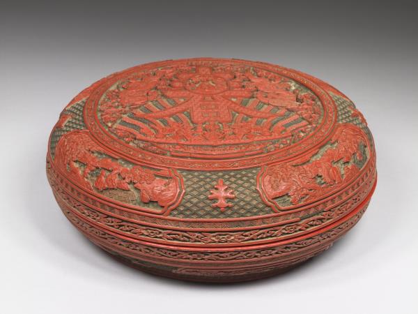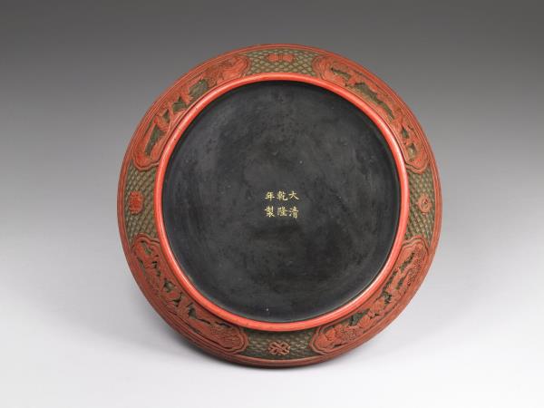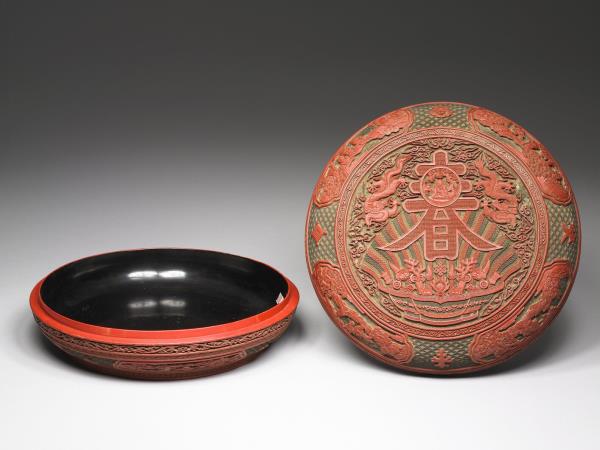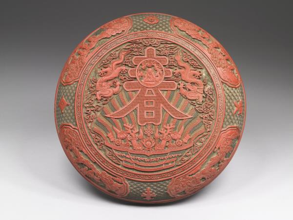 | 說明 | 圓形蒸餅式漆盒,矮壁淺圈足,漆面為紅色,器之外壁與器蓋皆剔彩纏枝花與山水人物為飾,蓋面有圓形開光,開光中構圖乃雕一聚寶盆滿盛珍寶、放出光芒,中央並有雕一大「春」字,內有一壽星端坐,「春」字旁有雙龍峙列飛舞雲間,上述圖像,均剔彩雕就,特其光芒三色交替呈現,又以別樣漆色襯之,皆見整器之優美與精雕細琢。器底有「大清乾隆年製」楷款。 |