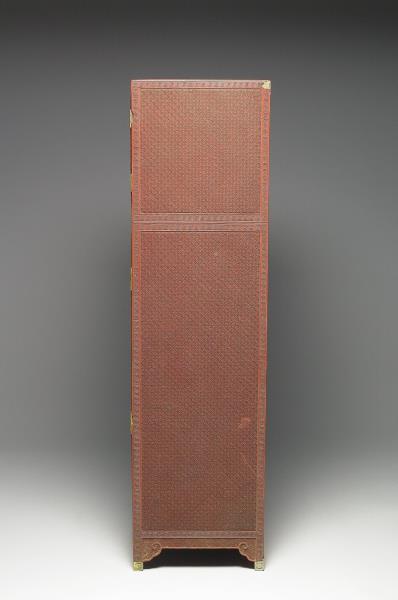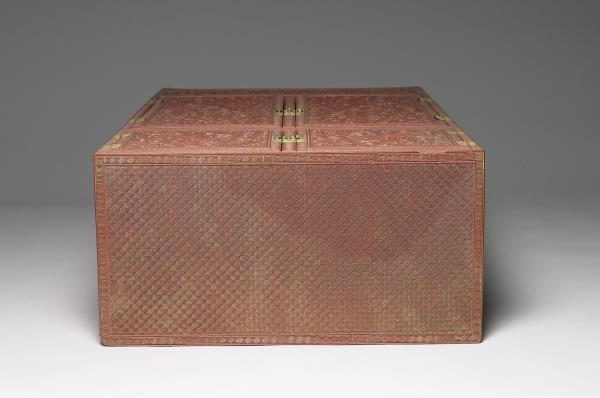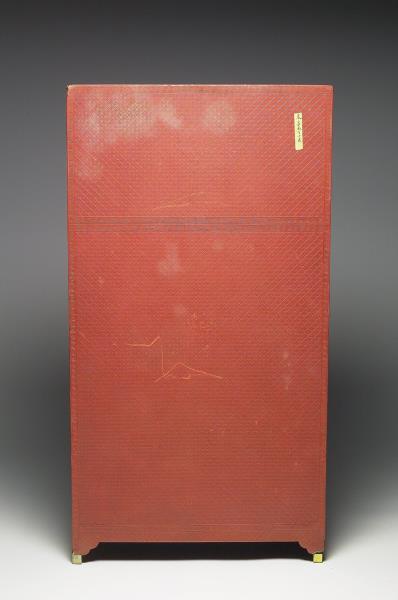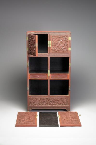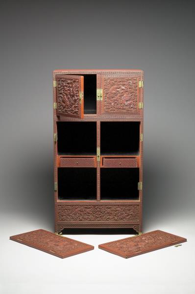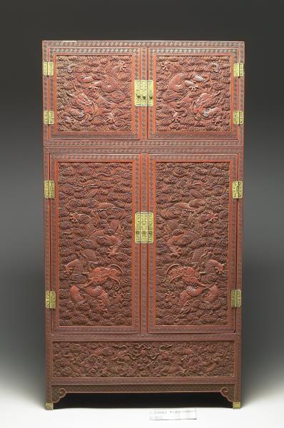剔紅長方形立式小櫃,分三層,上與中層為對開式門,嵌銅軸片與飾件。櫃中層較大,內有暗屜,恰等分中層櫃內空間。下層作抽屜,底有四如意形足。櫃面有四開光,皆雕雲龍飛舞其間。屜面雕雙龍搶珠為飾。邊界均飾回紋,器裡與底髹黑色光漆。